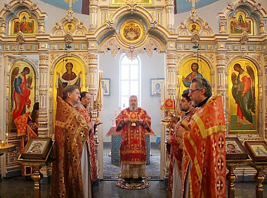 Его Преосвященству сослужили: секретарь Вяземской епархии протоиерей Валерий Калинин, старший священник Спасо-Богородицкого Одигитриевского монастыря иеромонах Даниил (Сычев), благочинный Гагаринского округа игумен Александр (Карпиков), благочинный Угранского округа иерей Александр Курмелев, настоятель храма в честь Всех святых, в земле Русской просиявших, пос. Игоревская иерей Николай Новиков.