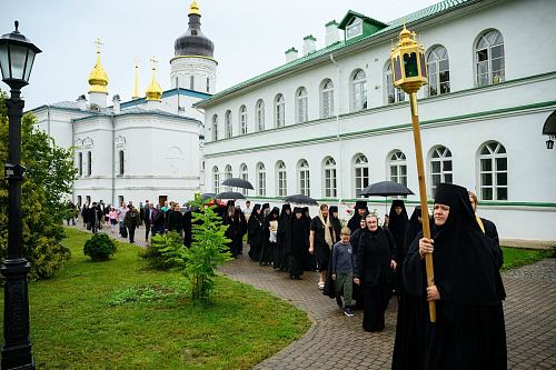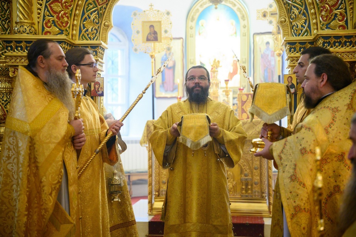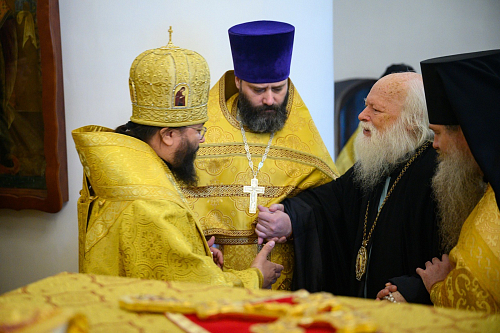 Его Высокопреосвященству сослужили: секретарь Псковского епархиального управления протоиерей Андрей Вахрушев, благочинный монастырей Псковской епархии иеромонах Иннокентий (Селезнев), игумен Филагрий (Кривых), старший клирик обители протоиерей Сергий Иванов, клирик обители иерей Георгий Горский.