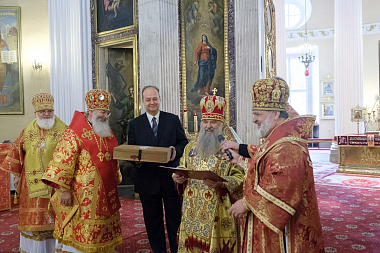 После благодарственного молебна владыка митрополит поздравил отца наместника с 10-летием архиерейского служения и огласил приветственный адрес Святейшего Патриарха Московского и всея Руси Кирилла. В подарок от Предстоятеля Русской Церкви владыке Назарию были преподнесены крест и панагия.