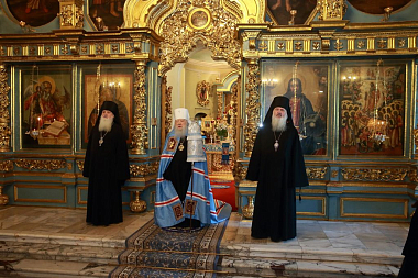 За Литургией Его Высокопреосвященству сослужили епископ Видновский Тихон, епископ Серпуховской Роман, секретарь Московского епархиального управления протоиерей Михаил Егоров, духовенство Московской епархии.