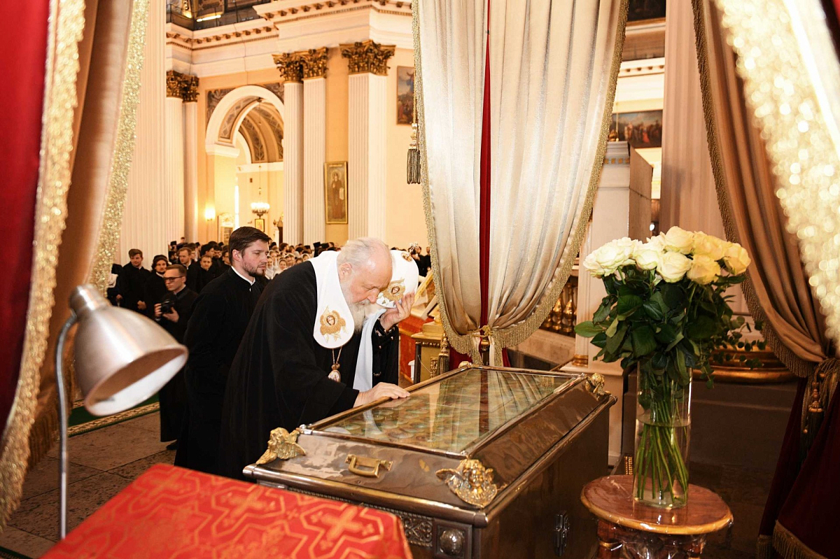 Святейший Патриарх Кирилл поклонился мощам святого благоверного великого князя Александра Невского и чтимой иконе Божией Матери «Скоропослушница Невская».