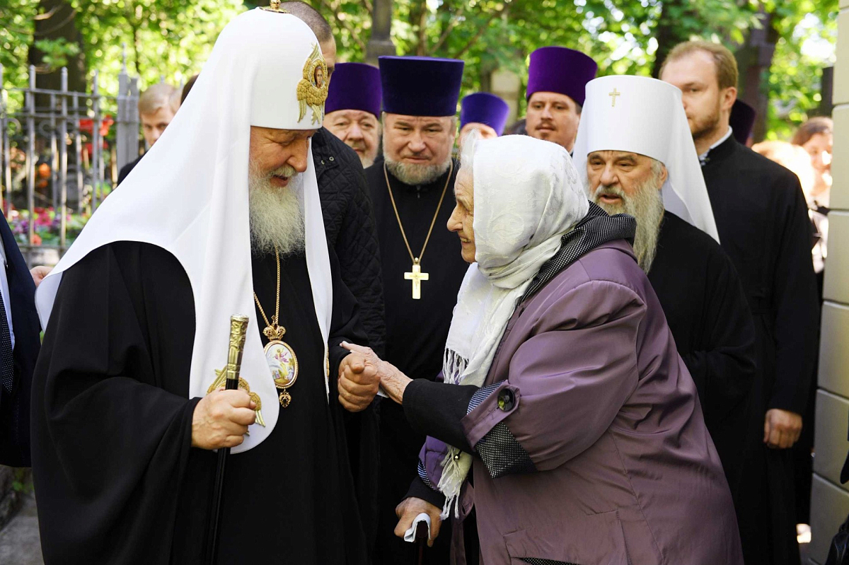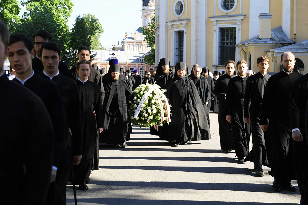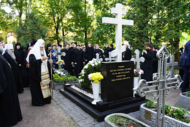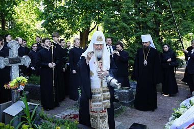 Из Троицкого собора Святейший Патриарх Кирилл в сопровождении митрополита Варсонофия, митрополита Сергия, епископа Назария, епископа Серафима и духовенства проследовал на Никольское кладбище монастыря, где возложил венок и совершил литию у могилы своего духовного наставника приснопамятного митрополита Никодима (Ротова).