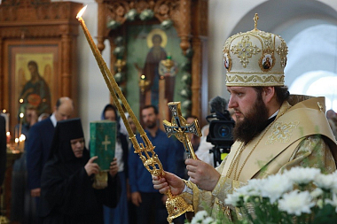 В завершении торжественного богослужения игумения Агния поблагодарила владыку за его архипастырский визит и в память об этом дне преподнесла Его Высокопреосвященству серебряный мощевик с изображением Святой Троицы и букет цветов. В свою очередь архиерей поблагодарил матушку настоятельницу за теплый прием и обратился к собравшимся с архипастырским словом.