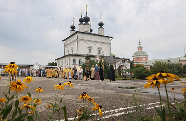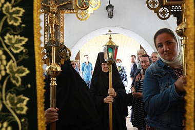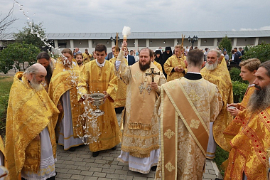 По окончании Литургии было совершено «молебное пение в праздник святого равноапостольного князя Владимира – воспоминания Крещения Руси» и крестный ход, по окончании которого владыка Аксий прочел молитвы святому равноапостольному князю Владимиру и преподобному Владимиру Белопесоцкому, а духовенство пропело величания святым.