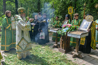 В тот же день, по многолетней традиции, на святом источнике в скиту в честь иконы Божией Матери «Живоносный источник» архипастырями и собором духовенства был отслужен водосвятный молебен.
