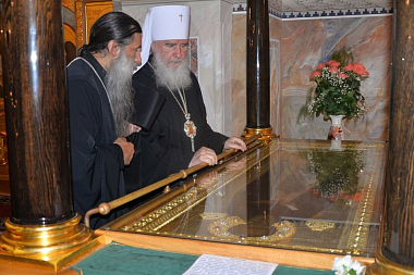 Митрополит Климент вместе с наместником монастыря посетил нижний храм собора в честь Преображения Господня, где помолился на месте, где предположительно пребывают мощи основателя обители преподобного Тихона Медынского, Калужского чудотворца.