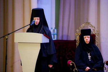 Далее к собравшимся обратилась заместитель председателя Синодального отдела по монастырям и монашеству, настоятельница Зачатьевского ставропигиального женского монастыря Москвы игумения Иулиания (Каледа). Матушка Иулиания зачитала приветственное слово участникам круглого стола председателя Синодального отдела по монастырям и монашеству митрополита Каширского Феогноста. В его тексте, в частности, сказано: «Святейший Патриарх Кирилл благословил в этом году проведение региональных круглых столов, посвященных теме почитания местных подвижников благочестия, новомучеников и исповедников Церкви Русской в монастырях. Мы благодарим Его Святейшество за эти встречи, помогающие нам глубже понять, что значит их подвиг для Церкви сегодня. Почти в каждом монастыре есть почитаемые подвижники благочестия, во многих есть отцы и матери, пострадавшие за веру. Кто-то из них уже прославлен в лике новомучеников и исповедников Церкви Русской, а кто-то еще нет, но все они, как звезды, светят нам, указывая путь к святости, к совершенству во Христе. В суровые для нашего Отечества годы XX столетия множество мучеников и исповедников Церкви Русской доказали свою верность Богу и Церкви даже до смерти. Совершая молитвенное поминовение подвижников благочестия, прославляя новомучеников и исповедников Церкви Русской, изучая их жития, собирая по крупицам воспоминания уже совсем немногих очевидцев их подвига, мы приобщаемся к их духовному опыту деятельной любви ко Христу, укрепляемся их силой и научаемся поступать достойно званию, к которому мы призваны. Молитвами подвижников благочестия, новомучеников и исповедников Церкви Русской да поможет и нам Господь быть верными свидетелями Его!»