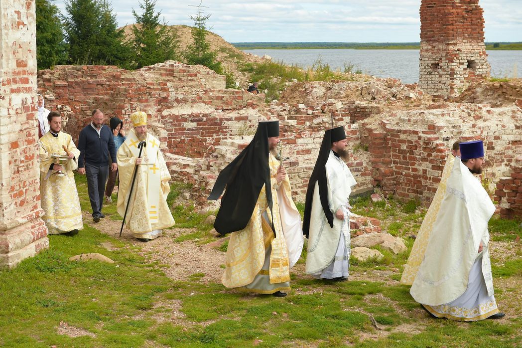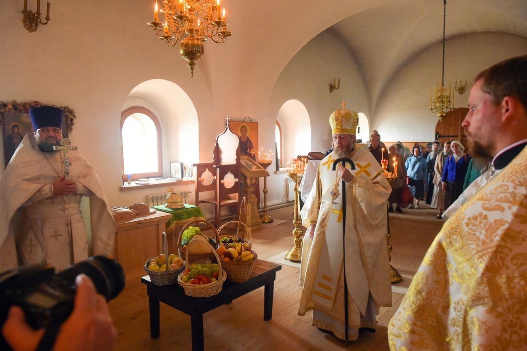 В завершение Литургии было совершено освящение плодов нового урожая. Затем состоялся крестный ход: духовенство, братия монастыря и прихожане прошли с молитвой вокруг взорванного в советские годы Спасо-Преображенского собора – главного храма монастыря. На развалинах храма было прочитано Евангелие, свершена молитва о восстановлении святыни.