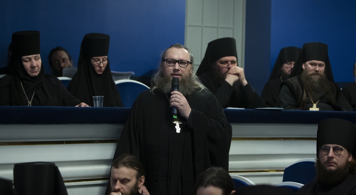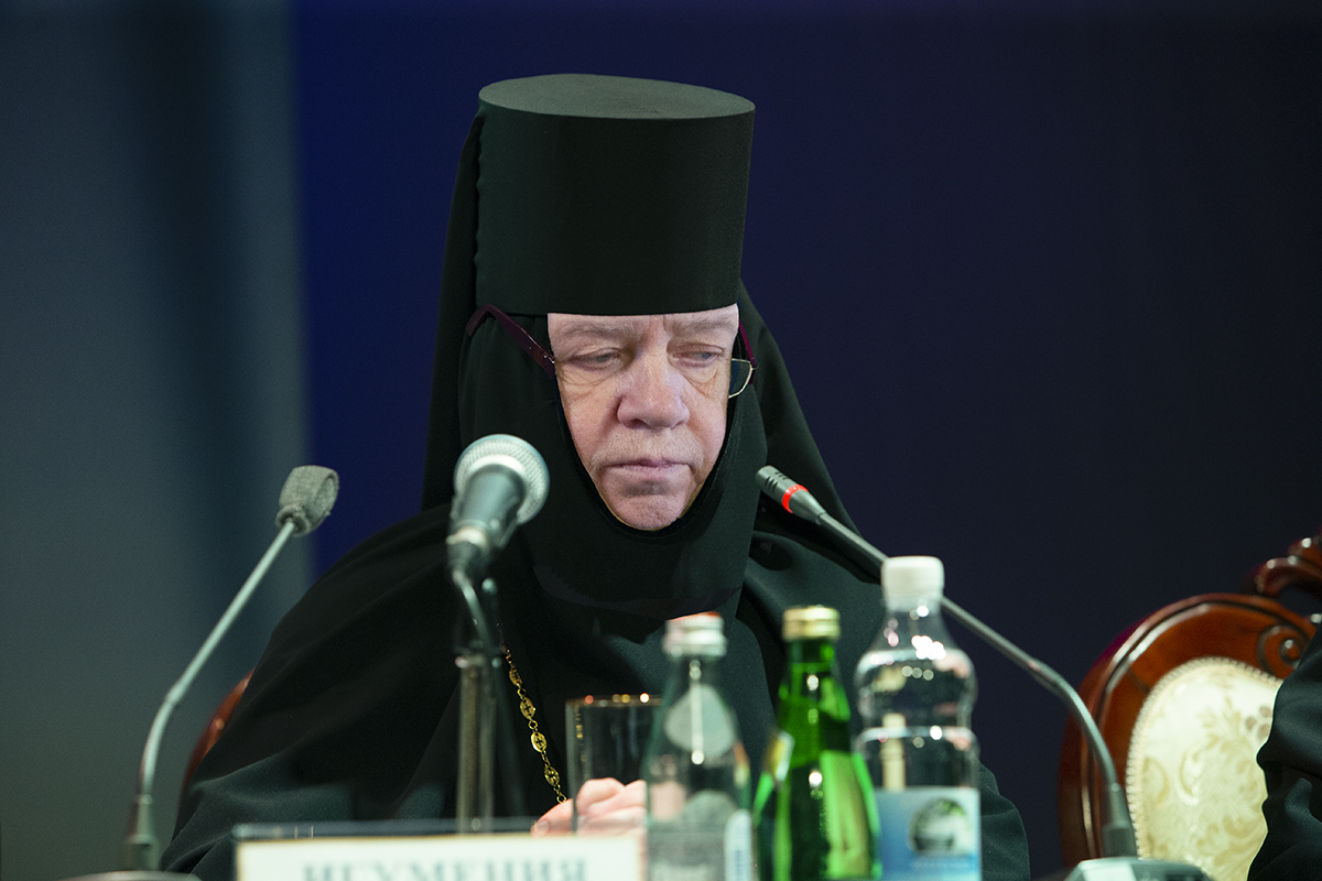 Игумен Иосиф (Крюков), начальник Московского подворья Спасо-Преображенского Валаамского ставропигиального мужского монастыря, раскрывая тему своего выступления «“Мне мир распялся и аз миру”: от чего отрекается молодой послушник и что приобретает» рассмотрел вопрос, в какой мере конфликт между «современным образом мышления» и «традиционными монашескими ценностями» влияет на выбор монашеского жития сегодня. Изменившиеся духовная и культурная картины мира оказывают существенное влияние на приходящих в монастырь послушников. Не каждый человек имеет должное представление о семейных ценностях, авторитете старших и ответственном отношении к равным и младшим. Не все получили опыт безграничной родительской любви и обладают способностью любить в ответ. Отсутствие готовности любить кого-то, кроме себя, порождает стремление любить только себя. Но «оставить мир» означает перестать жить для себя и начать жить для других, а первоочередной задачей монастыря является восполнение недостатка любви, ставшего причиной принятия ложных ценностей. Готовность служить другим свидетельствует о полноте личности, которая парадоксальным образом формируется как результат уединенного пребывания с Богом, и одна из причин личностного кризиса для многих, по мысли игумена Иосифа, это неумение пребывать в одиночестве. И если в миру человек был окружен впечатлениями и звуками, то монастырь должен предоставить послушнику соразмерное его духовным возможностям пространство, внутри которого он должен учиться быть один. Также докладчик рассмотрел в своем выступлении значение духовного руководства, образования и физического труда для современных послушников. В завершение игумен Иосиф сказал, насколько важно для игумена или игумении, встречая новых послушников, самим быть подлинными людьми и тем вдохновлять приходящих в монастыри.