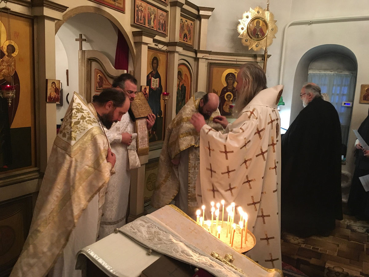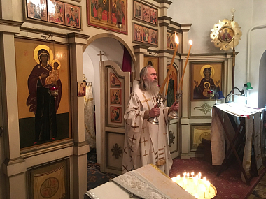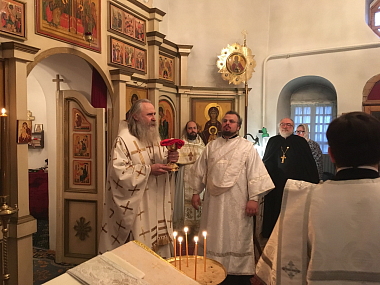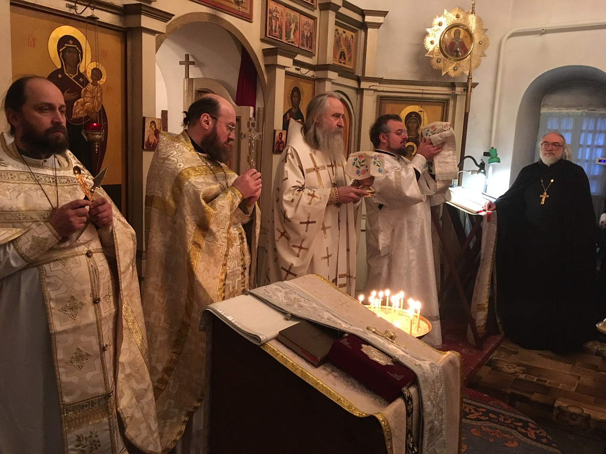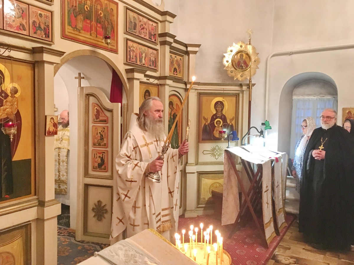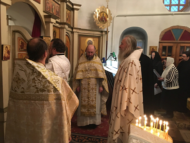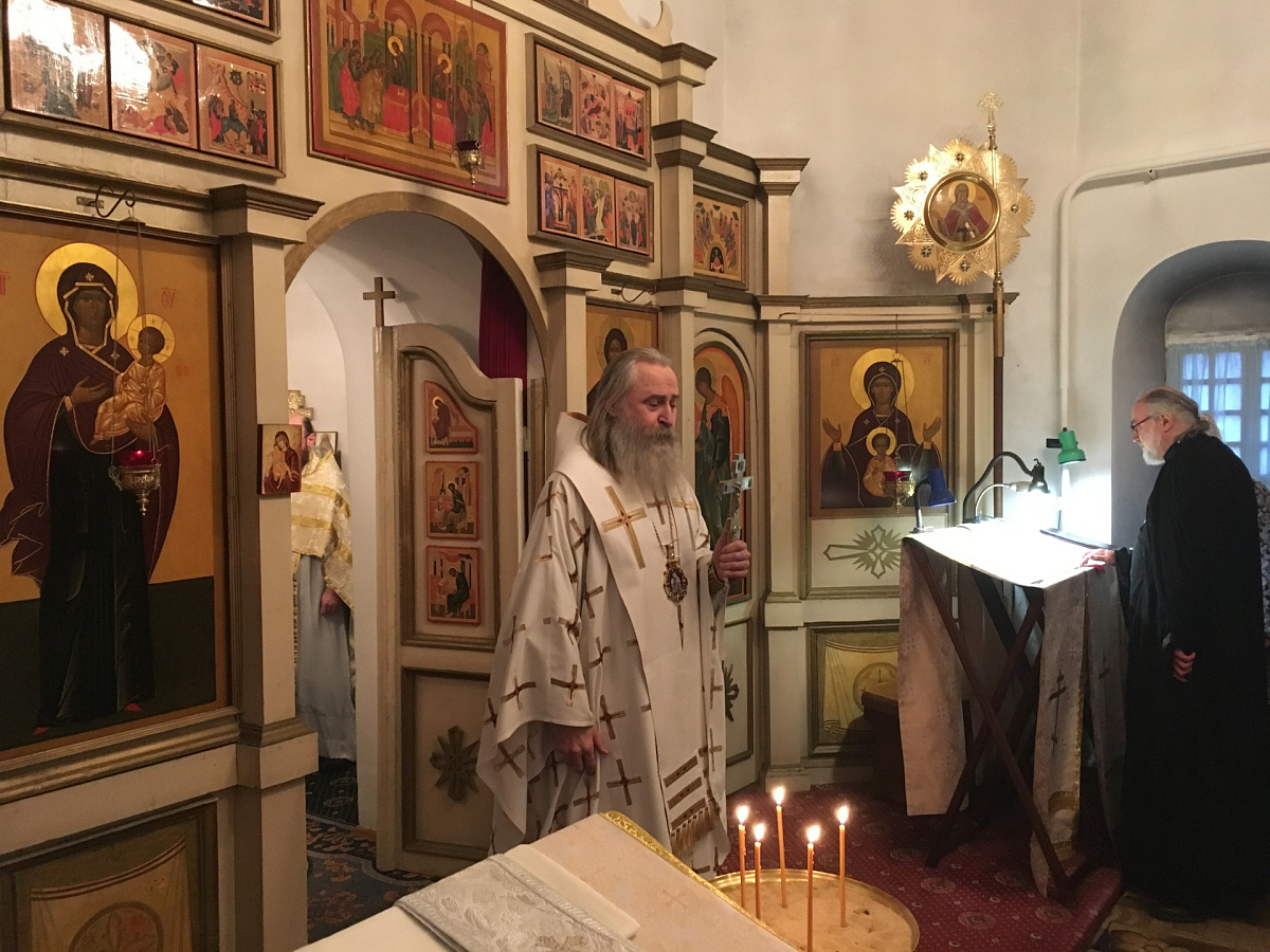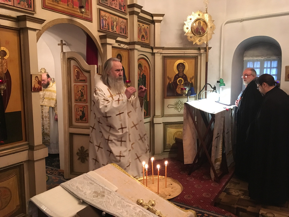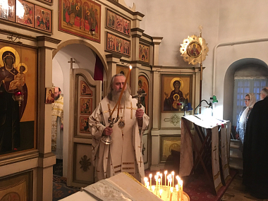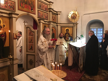 В храме во имя иконы Божией Матери «Знамение» Его Высокопреосвященству сослужили насельники Даниловой обители игумен Киприан (Сафонов) и игумен Иона (Займовский).