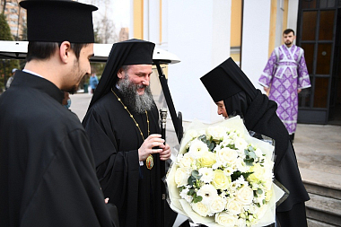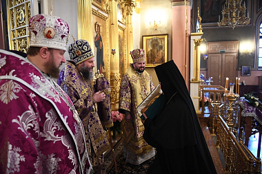 Далее к владыке Иоанну и сослужащим архиереям обратилась настоятельница Покровского ставропигиального монастыря игумения Феофания, сердечно приветствовав высокого гостя из братской Сербской Православной Церкви в стенах древней обители:
