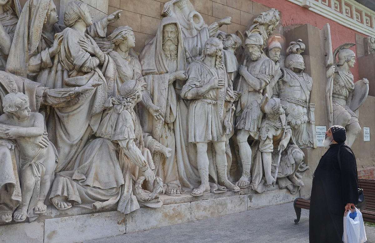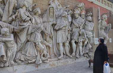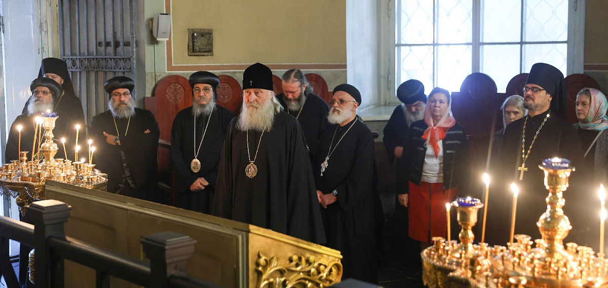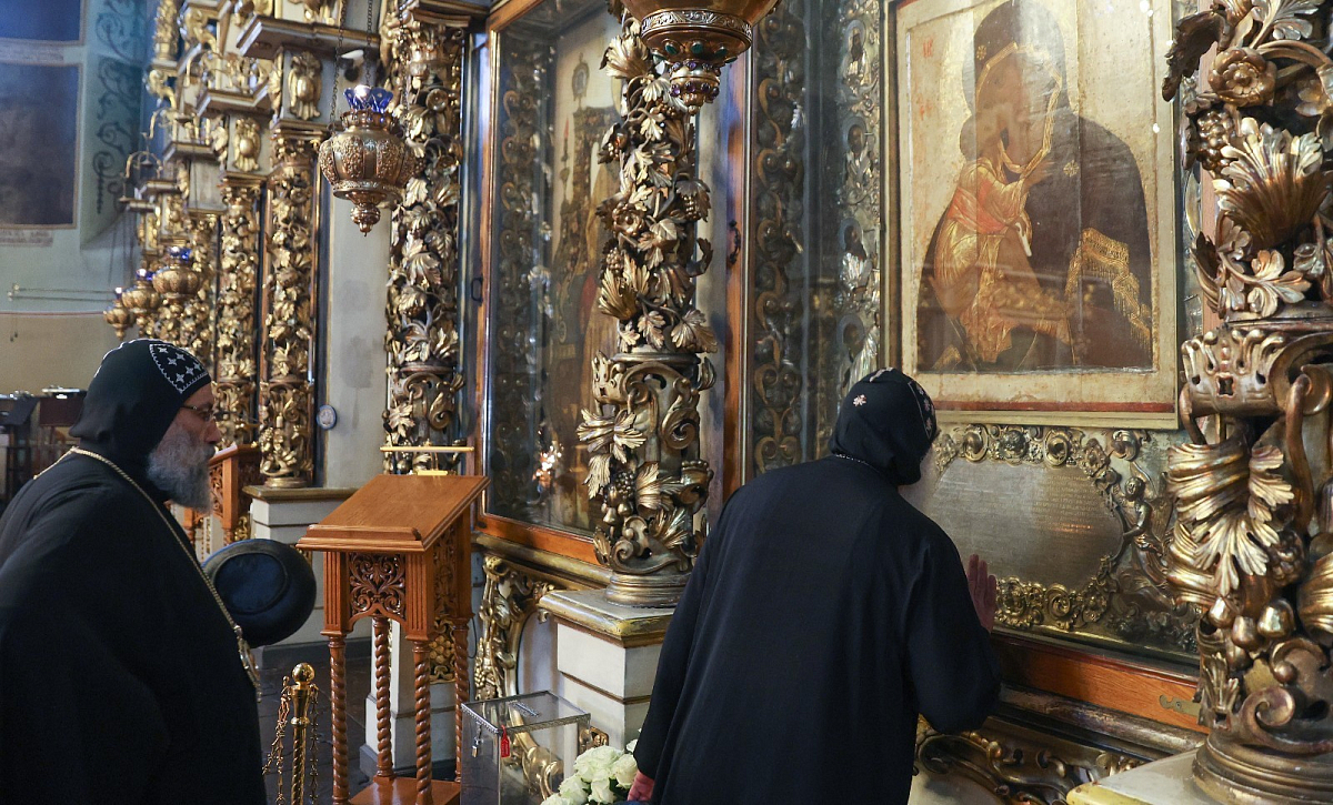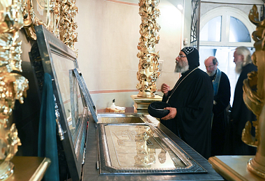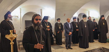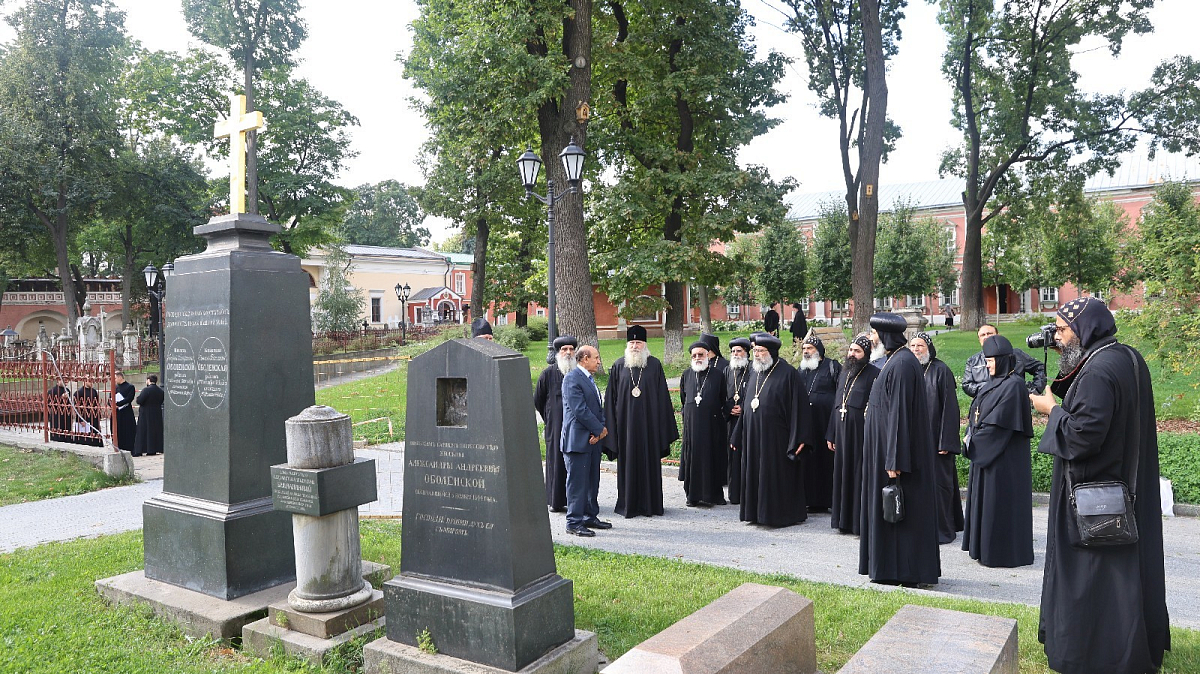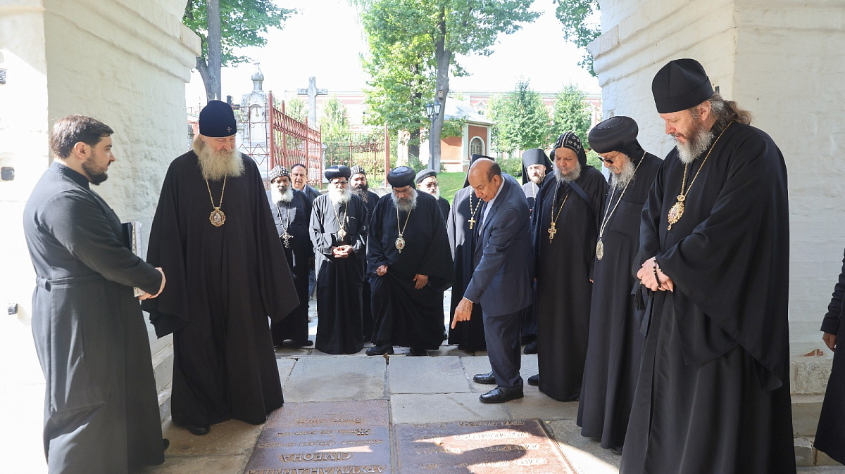Владыка Феогност провел для гостей экскурсию по храмам и территории монастыря. Коптская делегация посетила мемориальное кладбище Донской обители и осмотрела барельефы разрушенного Храма Христа Спасителя.