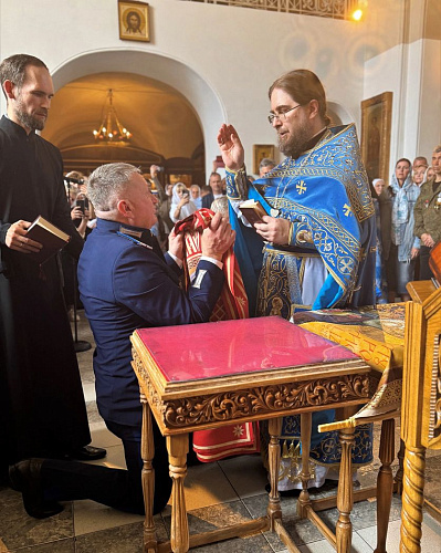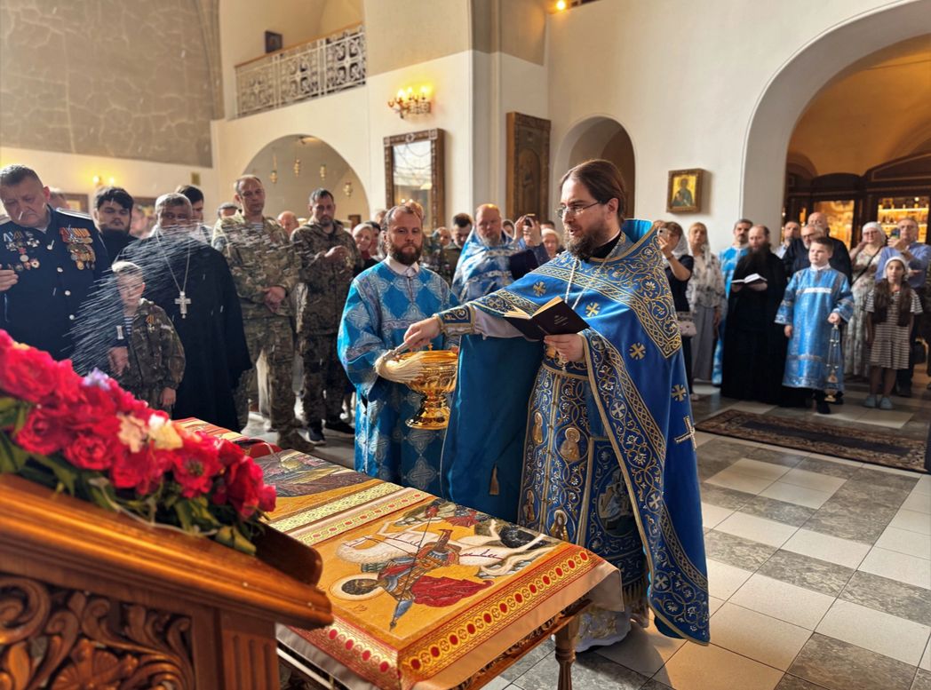 Чин освящения совершил игумен Иосиф (Крюков) в сослужении братии подворья в священном сане. За богослужением вместе с воинами и прихожанами молились временно исполняющий обязанности главы администрации Адмиралтейского района Санкт-Петербурга Д.В. Вакушин, руководитель Комитета Семей Воинов Отечества на Неве Л.С. Рубаник, координатор федерального партийного проекта «Женское движение Единой России» в Санкт-Петербурге И.Г. Бурба, организатор волонтерского движения «Феникс» и руководитель регионального Союза Ветеранов Боевых Действий «Отчизна» Е.А. Егорова, а также настоятель храма Тихвинской иконы Божией Матери в Сестрорецке и духовник Казачьего Цесаревича Алексия Батальона архимандрит Гавриил (Коневиченко).