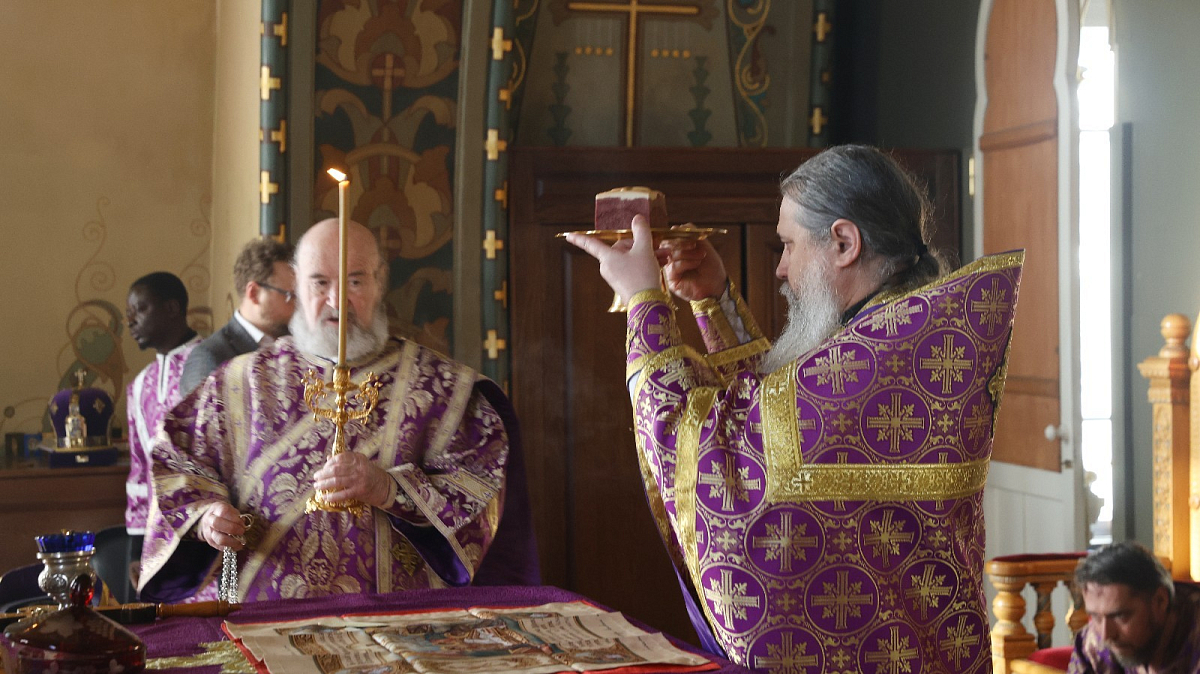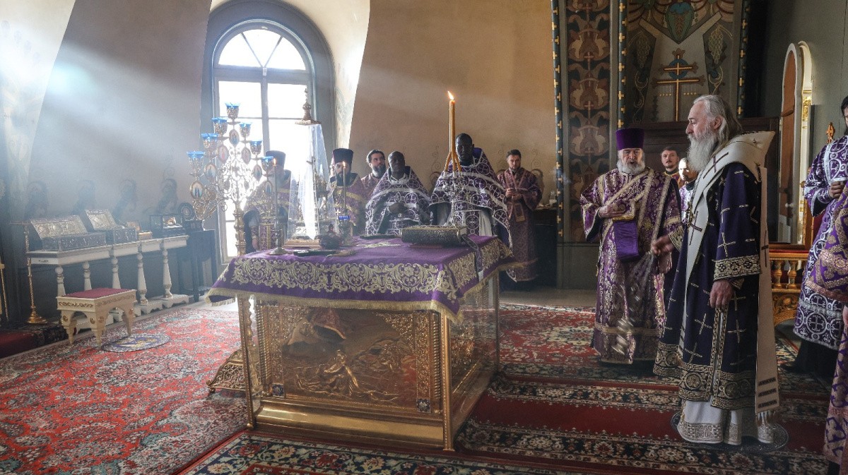 Его Высокопреосвященству сослужили священнослужители Патриаршего экзархата Африки иерей Сергий Воемава (ЦАР), иерей Павел Эме (Камерун) и монастырское духовенство.