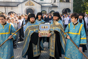 Перед богослужением состоялась торжественная встреча двух ковчегов с честными мощами двух великих русских святых – преподобной Евфросинии Полоцкой и преподобной Евфросинии Московской. Мощи преподобной Евфросинии Полоцкой принесены из Спасо-Евфросиниевского монастыря г. Полоцка (Республика Беларусь), мощи преподобной Евфросинии Московской – из кафедрального соборного Храма Христа Спасителя г. Москвы. В ближайшие недели ковчег с мощами прп. Евфросинии Полоцкой будет принесен в епархии России, а ковчег с мощами прп. Евфросинии Московской – в епархии Белорусского экзархата.