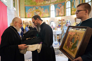Наместник Сретенского монастыря игумен Иоанн (Лудищев) приветствовал Предстоятеля Русской Церкви и преподнес Его Святейшеству напрестольный крест и книгу «Московский Сретенский монастырь. К 30-летию возрождения монашеской».