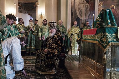 По окончании Литургии Святейший Патриарх Кирилл совершил славление у ковчега с частицей честных мощей святого благоверного князя Даниила.