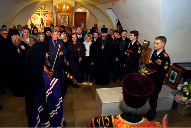 «У иконы этой был сложный путь, – продолжил свой рассказ Александр Николаевич. – Мы не знаем всех, кому она принадлежала, но так случилось, что архимандрит Сергий (Стуров), который долгие годы служил в Петербурге, а потом был настоятелем собора в городе Великие Луки, тяжко заболел: с ним случился удар, и он потерял способность двигаться. В этот тяжелый момент его духовные чада где-то нашли и подарили ему эту икону. Священнослужитель молился перед ней и исцелился. Сейчас он ходит и служит. И вот эту икону он передал в дар Великой княгине Марии Владимировне во время ее пребывания в Москве в апреле сего года. Государыня с благодарностью и очень трогательно приняла этот дар, но, учитывая его историю, понимая, что такой образ должен быть доступен не только ей, но многим верующим, она попросила благословения отца Сергия, чтобы икона осталась в России и была передана в Новоспасский монастырь. Я имею честь, дорогой Владыко, вручить Вам этот образ. Описание его прилагается».