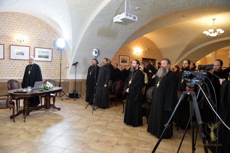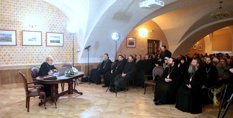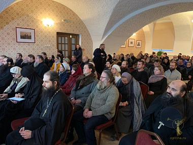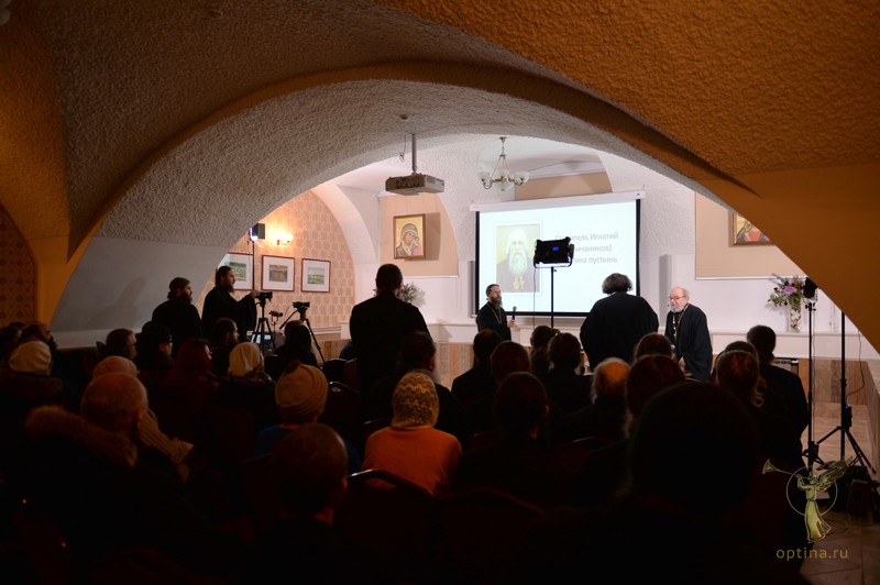 Открывая встречу, наместник Введенского ставропигиального мужского монастыря Оптина пустынь епископ Можайский Леонид отметил символичность момента: будущий святитель Игнатий (Брянчанинов) приехал в Оптину пустынь со старцем Львом (Наголкиным) в 1829 году. «И сегодня мы служили Божественную литургию с протоиереем Павлом Хондзинским и протоиереем Георгием Орехановым во Владимирском храме, где лежат мощи первого Оптинского старца преподобного Льва», – продолжил владыка. Обращаясь к многочисленной аудитории, собравшей, помимо насельников обители, представителей православной молодежной организации «Покров» при храме святых первоверховных апостолов Петра и Павла Московского подворья Оптиной пустыни, а также паломников из других мест, епископ Леонид выразил пожелание, чтобы каждый участник не только узнал какую-то информацию из лекции декана богословского факультета Православного Свято-Тихоновского гуманитарного университета протоиерея Павла Хондзинского и последующих за ней обсуждения и обмена мнениями, но и подумал бы об услышанном и спроектировал это на свою жизнь.