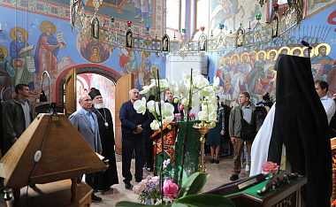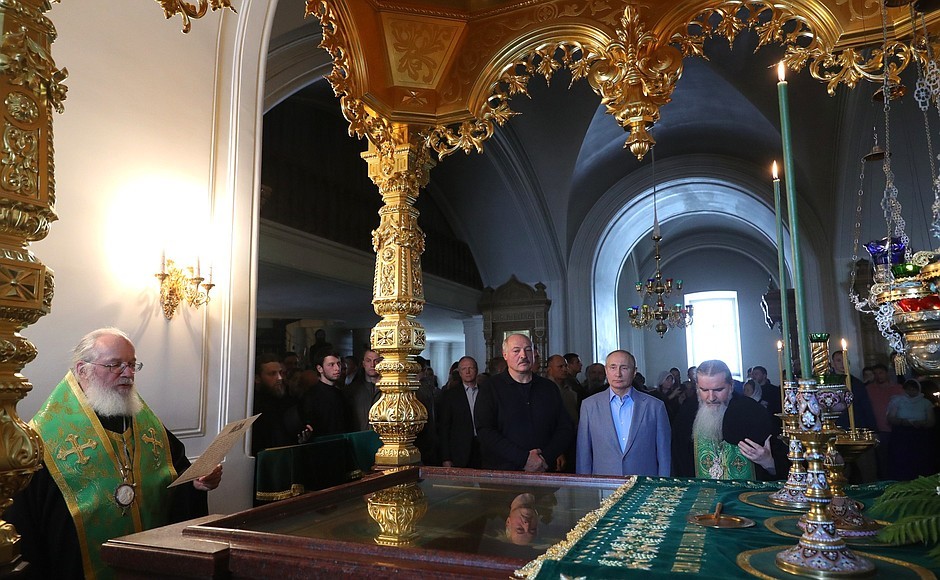 В.В. Путин и А.Г. Лукашенко осмотрели верхний и нижний храмы воссозданного собора Рождества Богородицы. Епископ Игнатий рассказал гостям об истории монастыря и его современной жизни, а также о торжествах по случаю 625-летия обители, которые завершились визитом Святейшего Патриарха Московского и всея Руси Кирилла 7 июля с.г.