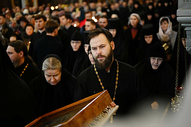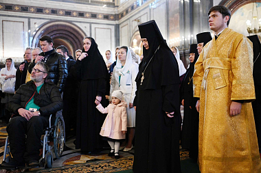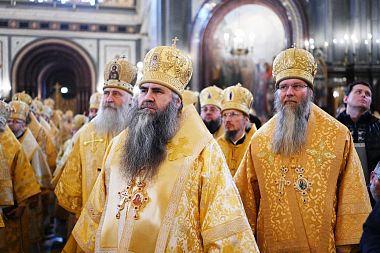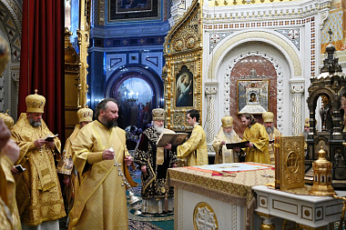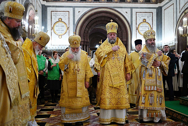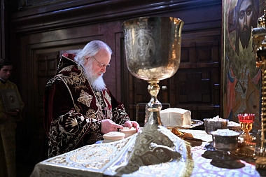 После сугубой ектении митрополит Крутицкий и Коломенский Ювеналий вознес молитву о Предстоятеле Русской Православной Церкви Святейшем Патриархе Московском и всея Руси Кирилле.