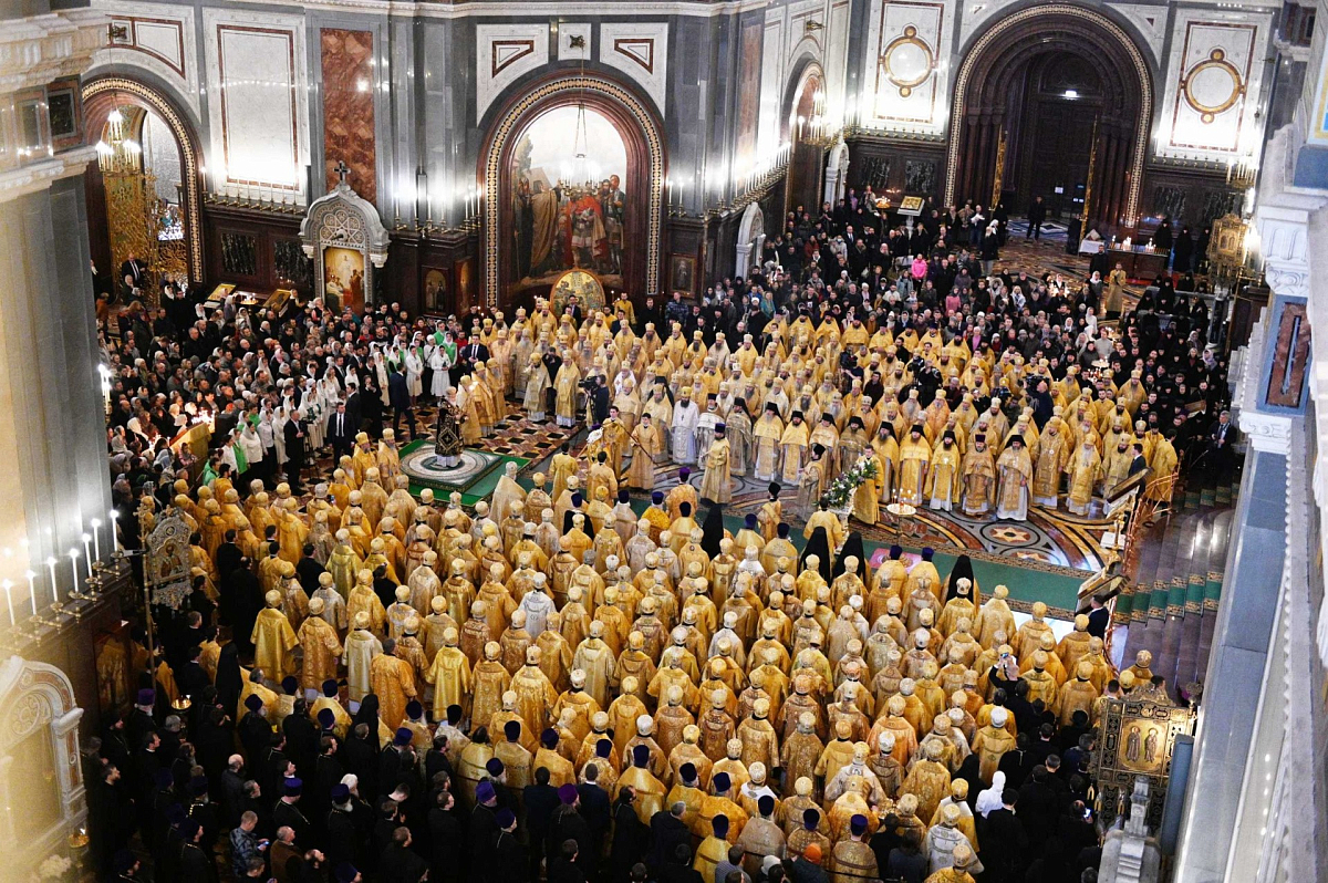 Его Святейшеству сослужили: Блаженнейший митрополит Киевский и всея Украины Онуфрий; митрополит Крутицкий и Коломенский Ювеналий, Патриарший наместник Московской епархии; митрополит Кишиневский и всея Молдовы Владимир; митрополит Астанайский и Казахстанский Александр, глава Митрополичьего округа в Республике Казахстан; митрополит Ташкентский и Узбекистанский Викентий, глава Среднеазиатского митрополичьего округа; митрополит Санкт-Петербургский и Ладожский Варсонофий; митрополит Минский и Заславский Павел, Патриарший экзарх всея Беларуси; митрополит Волоколамский Иларион, председатель Отдела внешних церковных связей Московского Патриархата; митрополит Воскресенский Дионисий, управляющий делами Московской Патриархии, первый викарий Патриарха Московского и всея Руси по г. Москве; митрополит Днепропетровский и Павлоградский Ириней; митрополит Чебоксарский и Чувашский Варнава; митрополит Екатеринодарский и Кубанский Исидор; митрополит Пермский и Кунгурский Мефодий; митрополит Берлинский и Германский Марк; митрополит Калужский и Боровский Климент, председатель Издательского Совета Русской Православной Церкви; митрополит Восточно-Американский и Нью-Йоркский Иларион; митрополит Омский и Таврический Владимир; митрополит Антоний (Черемисов); митрополит Самарский и Новокуйбышевский Сергий; митрополит Липецкий и Задонский Арсений; митрополит Евлогий (Смирнов); митрополит Тернопольский и Кременецкий Сергий; митрополит Виленский и Литовский Иннокентий; митрополит Курский и Рыльский Герман; митрополит Белгородский и Старооскольский Иоанн, председатель Синодального миссионерского отдела; митрополит Красноярский и Ачинский Пантелеимон; митрополит Йошкар-Олинский и Марийский Иоанн; митрополит Таллинский и всея Эстонии Евгений; митрополит Екатеринбургский и Верхотурский Кирилл; митрополит Иваново-Вознесенский и Вичугский Иосиф; митрополит Ростовский и Новочеркасский Меркурий, председатель Синодального отдела религиозного образования и катехизации; митрополит Луганский и Алчевский Митрофан; митрополит Брянский и Севский Александр; митрополит Курганский и Белозерский Даниил; митрополит Тамбовский и Рассказовский Феодосий; митрополит Нижегородский и Арзамасский Георгий; митрополит Оренбургский и Саракташский Вениамин; митрополит Саратовский и Вольский Лонгин; митрополит Рязанский и Михайловский Марк; митрополит Улан-Удэнский и Бурятский Савватий; митрополит Кемеровский и Прокопьевский Аристарх; митрополит Бориспольский и Броварской Антоний; митрополит Сингапурский и Юго-Восточно-Азиатский Сергий, Патриарший экзарх Юго-Восточной Азии; митрополит Кировоградский и Новомиргородский Иоасаф; митрополит Новосибирский и Бердский Никодим; митрополит Ставропольский и Невинномысский Кирилл, председатель Синодального комитета по взаимодействию с казачеством; митрополит Орловский и Болховский Тихон; митрополит Саранский и Мордовский Зиновий; митрополит Ханты-Мансийский и Сургутский Павел; митрополит Тверской и Кашинский Савва; митрополит Вологодский и Кирилловский Игнатий, председатель Финансово-хозяйственного управления Московского Патриархата; митрополит Архангельский и Холмогорский Корнилий; митрополит Владивостокский и Приморский Владимир; митрополит Иркутский и Ангарский Максимилиан;