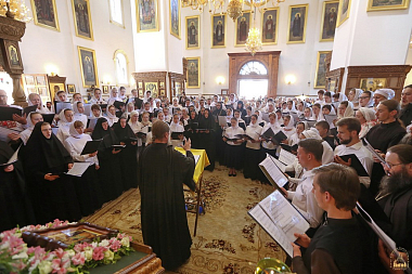 Богослужебные песнопения исполнили два хора святогорской братии и объединенный хор под руководством регента иеродиакона Ипатия (Малютина).
