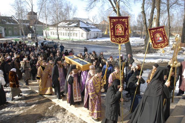 В нашей беседе хочу обратить внимание и на другую сторону, не менее важную: на крестные ходы с Вышенскими святынями: чудотворной иконой Божией Матери Казанской Вышенской и мощами святителя Феофана Затворника. Такие крестные ходы прошли в Тамбовской, Тверской, Владимирской, Рязанской, Орловской, Элистинской и Калмыцкой, Ханты-Мансийской епархиях, а также по многих епархиях Украины, что помогло людям больше узнать о святителе, дало им возможность помолиться у святынь, испросить небесного предстательства и покровительства в различных нуждах и обстояниях.