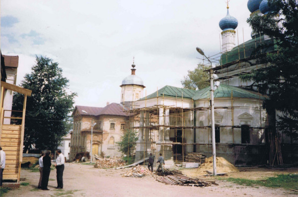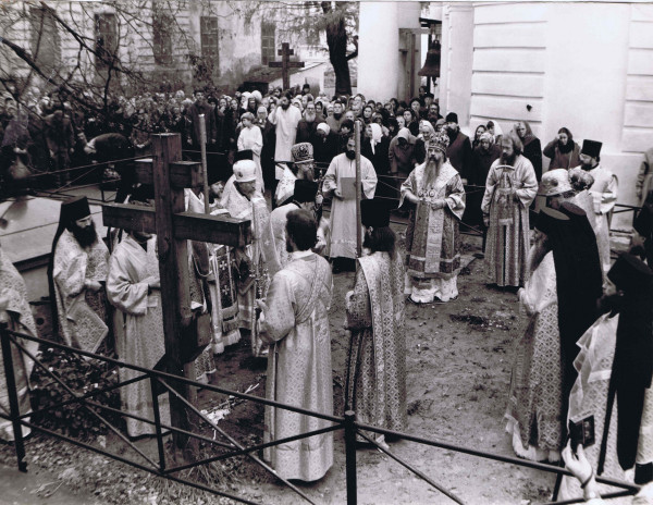 Должен сказать, что до нас здесь какое-то время подвизался иеромонах Иосиф (Братищев), ставший впоследствии наместником возрождающегося Спасо-Преображенского Соловецкого ставропигиального монастыря. Его направили сюда со строителями из Управления по реставрации и строительству Московского Данилова монастыря, и где-то они произвели ремонт, что-то подновили, облагородили. Отец Иосиф входил во взаимодействие с государственной властью, с местными жителями, подготавливал почву для возобновления монашеской жизни. Он был как форпост – передовой пункт, начало и оплот в развитии. Видимо, это его заслуга, что в надвратной церкви в западной башне, увенчанной фигуркой трубящего Ангела, появились фанерный иконостас, временный престол, жертвенник. И вот там первое время совершался весь круг суточных богослужений, начавшихся после нашего приезда. Сразу, как только мы прибыли и пообедали, отец-наместник благословил нас собраться за Введенским собором у того места, где упокоилась большая часть оптинских старцев. Мы отслужили панихиду, а вечером было всенощное бдение. На следующий день – в праздник Владимирской иконы Божией Матери – архимандрит Евлогий совершил освящение храма иерейским чином вместе со своим братом протоиереем Вадимом Смирновым, позже принявшим монашество с именем Никон и ставшим настоятелем Московского подворья Афонского Пантелеимонова монастыря. (Сейчас отец Никон подвизается на Святой Горе Афон). Затем они отслужили первую Божественную литургию. Службы пошли ежедневно: утром и вечером, утром и вечером… И каждый день были причастники! Выглядело это интересно: одна цепочка спускалась вниз по ступенькам храма – к запивке, другая цепочка поднималась по ступенькам вверх – к Чаше. Между службами привлекались к труду паломники, потому что крутые деревянные лесенки нужно было подмести, промыть. Только успеют сделать уборку в храме, начинается следующая служба. А когда пройдет по ступенькам человек 80 – то вниз, то наверх, снова надо убирать. Я хорошо запомнил 6 июня 1988 года. В Троице-Сергиевой лавре открылся Поместный Собор, приуроченный к 1000-летию Крещения Руси, а к нам в этот день пришло очень много народа и было более 40 причастников. В какой-то момент появилось ощущение, что плотина, долго сдерживавшая воду, рухнула. С одной стороны, советская власть еще была, был еще жив Советский Союз, но стало очевидным, что уже никак не удержать религиозно-церковную жизнь.