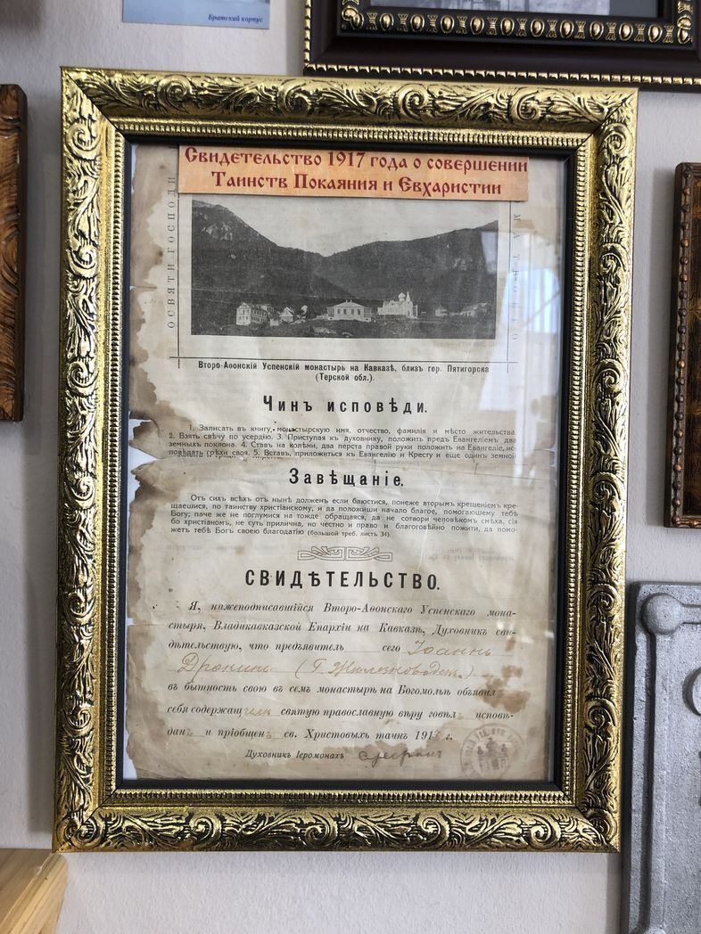 Наш библиотекарь Мария Волчанова передала свидетельство о Крещении, датированное 1915 годом, а также заверенное духовником монастыря свидетельство об участии в таинстве Исповеди и Причащении Святых Христовых Тайн в нашем монастыре в 1917 году, выданное жителю г. Железноводска Иоанну Дрокину. И еще много интересных экспонатов – в одном интервью всего не перечислить…