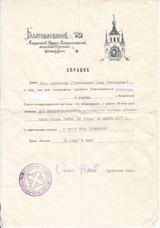 Конечно, он молился о маме. Звонил ей каждый вечер. Давал духовные наставления, советовал, как себя вести, что делать. Хочу заметить, что все последующие годы после знакомства с отцом Илием мама постоянно к нему ездила. И в Оптину, и в его в домик под Козельском, и (когда он стал духовником Святейшего Патриарха Кирилла) в Патриаршую резиденцию в Переделкино. Когда не могла поехать, а нужно было решить какой-то важный вопрос, она молилась, чтобы батюшка как-то связался с ней. У них была какая-то незримая духовная связь, словно они слышали друг друга на расстоянии. Старец всегда ее поддерживал, не оставлял один на один с трудностями. Конечно, после принятия монашества мама стала молитвенно обращаться к своей Небесной покровительнице – мученице Агриппине, удивительной святой. Из жития святой известно, что она, девушка из знатного рода, с юности посвятила себя Богу, и многие юные девы и женщины зрелого возраста стремились разделить ее образ жизни. А язычники обвинили Агриппину, что она восстает против института брака и с помощью мошенничества обманывает девушек. В страшных мучениях святая исповедница предала Богу душу и унесла на Небеса победный венец.