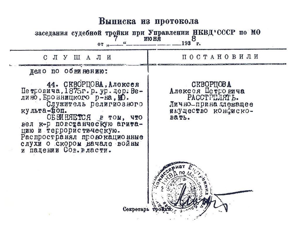 – Это особая фотография, – говорит монахиня Феонилла (Харченко), ездившая в свое время на малую родину новомученика – в село Велино Бронницкого района и в храмы Раменского района, где в последние годы своей жизни он служил, – в Гжель и Загорново. – Лидия Алексеевна Головкова, старший научный сотрудник Православного Свято-Тихоновского гуманитарного университета, изучая следственные дела в ходе исследования таких тем, как мученики и исповедники Русской Православной Церкви XX века, репрессии и репрессивные органы, тюрьмы и лагеря, где проходили годы заточения страдальцев за Христа, рассказала нам, что, кроме «расстрельных списков», есть «расстрельные снимки». Точнее, контрольные снимки для расстрельщиков. Когда 7 июня 1938 года тройка НКВД приговорила протоиерея Алексия Скворцова к высшей мере наказания, его сфотографировали. Это был день празднования Третьего обретения главы Иоанна Предтечи, и можно сказать, что крестный путь батюшки, которому шел тогда 64-й год, завершился под покровительством святого Иоанна Предтечи.