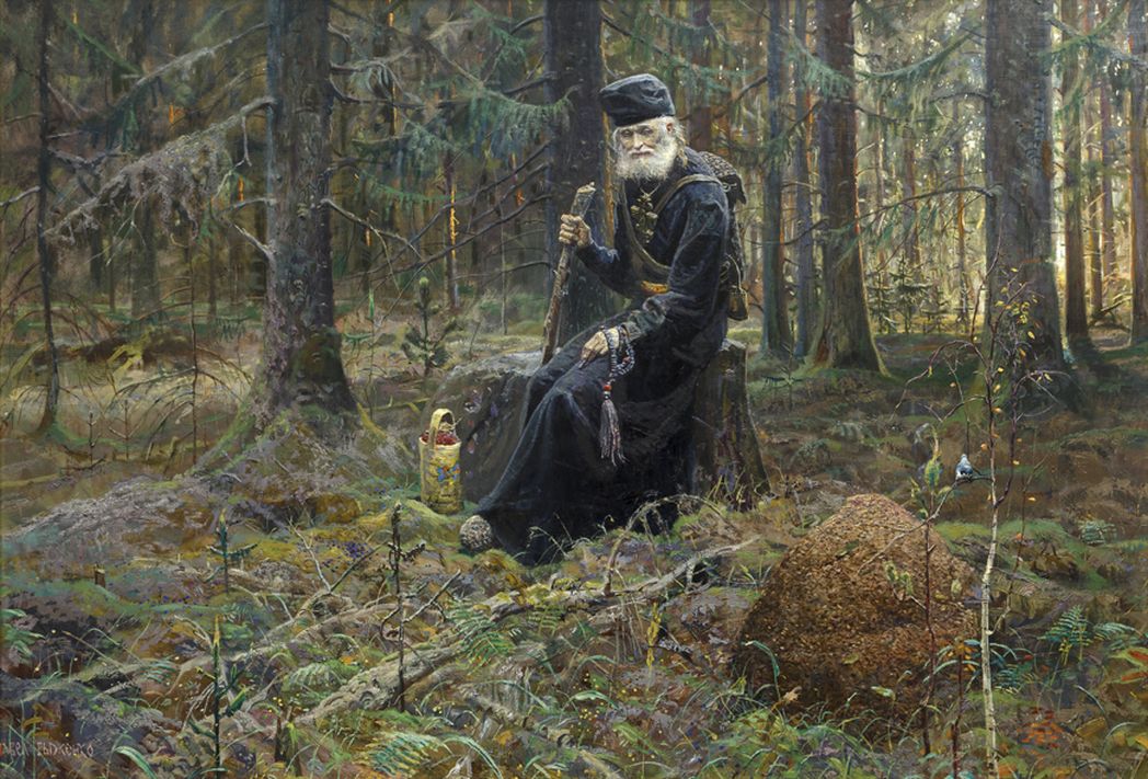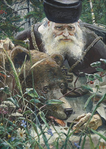 Преподобному Серафиму он посвятил триптих (2006). В центральной работе святой изображен занимающим все изобразительное пространство, даже выходящим за него: если он встанет, то фигуре точно не хватит места на холсте. Тем самым подчеркивается духовная мощь, величие святого. Еще на картине – медведь, собирающийся взять хлеб из рук преподобного, кружево растений – цветов, травы на переднем плане, зелень леса на заднем – все это говорит о гармонии, в которой святой находится со всем окружающим миром. В левой части триптиха – то, что ведет к гармонии, внутренней тишине – сосредоточенная, упорная молитва. И лес на ней уже далеко на такой благостный – колючие сухие ветки елей без иголок, резкое движение совы летящей куда-то вперед – все это заставляет вспомнить о тех искушениях, с которыми сталкивался святой во время своего молитвенного подвига. В первой части триптиха святой выходит к людям. Здесь тоже есть сухие колючие ветки, но они словно расступаются – за спиной преподобного остается широкая дорога…