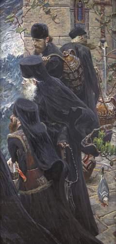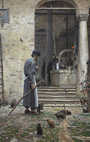 Но путь жизни тех, кто отказался от мира, совсем не всегда спокоен и тих, чтобы прийти к «тихости», нужно выстоять, не поддаться ветрам и бурям искушений, надо быть твердыми, как древние каменные стены, – об этом, в том числе, и работа художника «Братия» (2006).