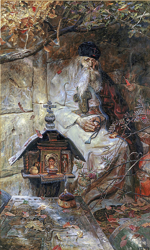 Внутренней сосредоточенностью полна картина «Молитва» (2001). Крепкие каменные стены словно контрастируют с физической немощью пожилого монаха, но, вместе с тем, подчеркивают мощь его духа, крепкую силу молитвы. Опадающие и уже опавшие листья помогают зрителю понять, что на дворе – осень, что можно читать здесь и как приближение окончания земного пути героя. Но вместе с тем, в картине есть красные, пасхальные цвета, которые напоминают нам о настоящей Жизни.