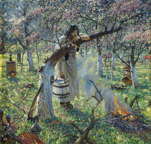 Другой герой Куликовской битвы – Родион Ослабя тоже изображен застывшим в молитвенном раздумье (2005). Мир вокруг него прекрасен, наполнен солнцем, зеленью, благоуханьем цветущих деревьев. Но справа, на переднем плане – щит, шлем – напоминание, что скоро герою предстоит идти в бой. Но все-таки, перед нами не просто изображение воина, которому предстоит погибнуть в тяжелой битве, а образ воина Божьего, высота и глубина которого простираются за рамки ратной тематики.