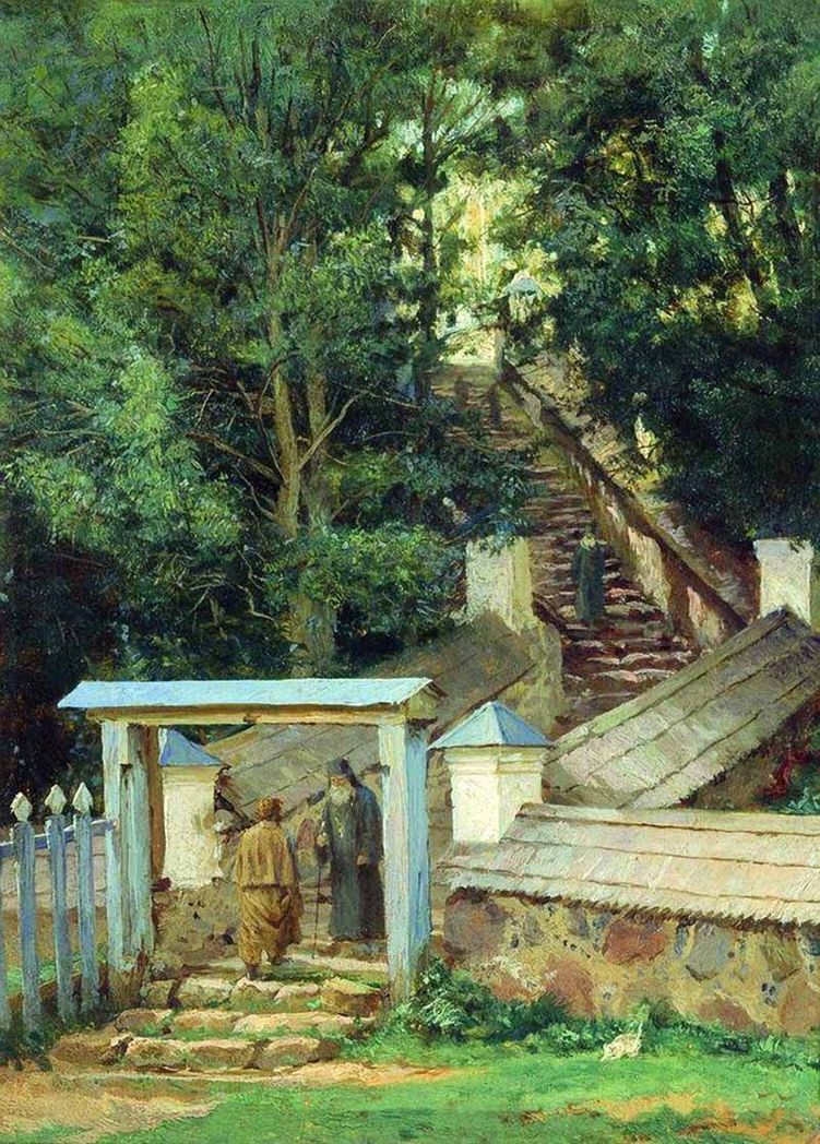 Василий Максимов (1844–1911) принадлежал к когорте передвижников и тоже изображал «правду жизни» (в которую, кстати, несмотря ни на что, порой прорывается нечто большее, и в которой есть своя красота). В его работе «У ограды скита» первое, что привлекает внимание, – врата, контрастно написанные, а потому сразу зрительно читающиеся. И – лестница вверх, то есть вход и путь. Путь к свету, пробивающемуся там, наверху. И только потом уже взгляд обращается на фигуры людей: это пожилой монах у входа, встречающий мирянина, который делает шаг ему навстречу, и другой монах на лестнице. В данном случае художник не стремится показать истории конкретных героев – те словно растворяются в окружающем; более важным оказывается сама идея пути вверх, его возможности. В работе очень много зеленого – цвета жизни, причем не той, будничной, что осталась за рамками изобразительного пространства...