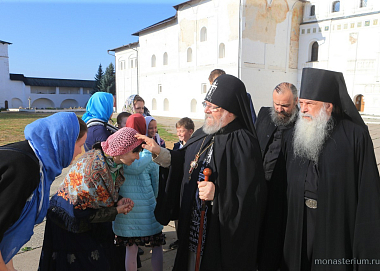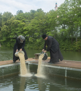 В этой связи хочется особо отметить один момент: помощь из монастыря идет большая. Обитель помогает продуктами епархии, духовной семинарии, духовному училищу. А многодетные семьи, которые живут поблизости и имеют хозяйство, чаще всего просят сено для своей живности, так что сено заготавливается и в расчете на них. На подсобном хозяйстве самого монастыря какой только живности не увидишь: коровы, поросята, куры, гуси! В больших искусственных прудах, вырытых более пяти столетий назад – только представьте, вручную! Глубиной в 11 метров! – выращивают карпа зеркального, карпа обычного, белого амура, карася, толстолобика. Еще зашла в пруды, сообщил отец-эконом, речная рыба: окунь, плотва, налим, лещ. Так что рыбное хозяйство требует специальных знаний и навыков. Батюшка вспомнил, что преподобный Пафнутий во время голода распорядился кормить в монастырской трапезной ежедневно до тысячи человек. И Господь помогал ему. Сейчас много паломников прибывает в выходные дни – их здесь кормят бесплатно. И православных туристов, совершающих путешествие по Золотому кольцу и заезжающих в монастырь. Нижняя трапезная открыта для богомольцев с самого утра до девяти вечера. Немало людей приезжает в дни постов, особенно Великого поста – пожить здесь какое-то время и помолиться. О них тоже заботу немалую проявляют. А уж на престольные праздники народу бывает! Братии одной не справиться, и тут подключаются сестры двух монастырей, которых направляют сюда настоятельницы – игумения Николая (Ильина) из Свято-Никольского Черноостровского женского монастыря в Малоярославце и игумения Анастасия (Мордмилович), настоятельница Казанского женского монастыря в Калуге и Спасо-Преображенского Воротынского женского монастыря. Кстати, продолжая тему помощи, исполняющий обязанности наместника монастыря иеромонах Пафнутий добавил к рассказу отца Аникиты такой факт: обитель никогда не отказывает в материальной помощи погорельцам и другим людям, оказавшимся в бедственном положении. «Это дело Божие, – сказал он. – Монастыри всегда помогали народу».