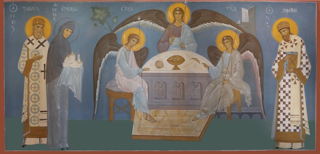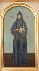 И одной из самых ярких женщин в семье Тютчевых, как написано в книге «Процветет обитель моя...», была Евдокия (Авдотья) Николаевна, в замужестве – княгиня Мещерская, в монашестве – игумения Евгения. Открываешь книгу, на форзаце видишь иллюстрацию – фреску из небольшого привратного храма обители, посвященного святителю Димитрию Ростовскому. На ней изображены игумения Евгения с предстоящими святителем Филаретом Московским и святителем Димитрием Ростовским, в центре композиции – Пресвятая Троица (храм Живоначальной Троицы с двумя приделами: Богородичным и в память о почившем супруге – Борисоглебским – является главным монастырским храмом). Совершенно ясно, почему на фреске рядом с матушкой-настоятельницей изображен святитель Филарет, который, возглавив Московскую кафедру, способствовал открытию этого первого в епархии общежительного женского монастыря. Он же совершил монашеский постриг княгини Мещерской, и на следующий день она была посвящена в сан игумении Борисоглебской Аносиной обители. Он же освящал и собор Живоначальной Троицы, и храм святителя Димитрия Ростовского Чудотворца.