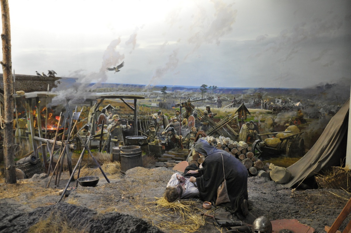 Подведя нас к иконе Владимирской Божией Матери на первом этаже музейного комплекса, экскурсовод диорамы Ольга Лареева напомнила, что чуть ранее, в XIV веке, при нашествии Тамерлана, наводившего на всех ужас своими опустошениями и жестокостью, русские люди так же со слезами на глазах молились перед чудотворным образом, который по повелению Великого князя Московского Василия Дмитриевича был привезен в Москву из Владимира. Тогда жестокий полководец Тамерлан увидел сон: Лучезарная Жена (как ему растолковали приближенные, то была Матерь Бога Христианского, Заступница русских) отдает строгое приказание оставить пределы России. И непобедимый завоеватель, «бич народов», дальше Ельца не пошел, а повернул свои полки обратно.