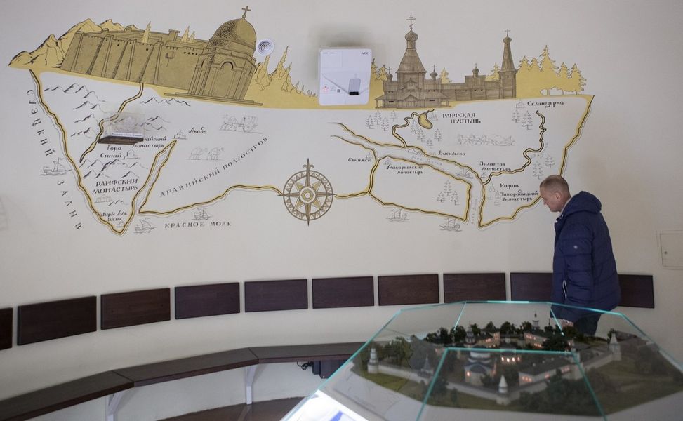 По признанию наместника монастыря игумена Гавриила (Рожнова), создание музея потребовало много сил и времени – почти года напряженнейшей работы. В первую очередь стали приводить в порядок отсыревшую из-за дождей и снега, из-за непосредственной близости Раифского озера башню XVII века. Укрепляли фундамент, делали гидроизоляцию, проводили трудоемкие строительные работы, а параллельно шли горячие обсуждения: хотя башня имеет четыре яруса, все равно пространство будет камерное – и как расположить в нем артефакты и максимально насытить эту небольшую экспозиционную площадь информацией? Масса интересных решений была найдена вместе со специалистами казанской дизайн-студии «Айбат», до этого оформлявшими музей истории соседнего Свияжского Богородице-Успенского мужского монастыря. Входишь в музей Раифы и сразу видишь перед собой две необычные карты. Топографическая карта-схема данной местности нарисована на полу с изображением животных и деревьев, условным обозначением селений и рек, и сделано всё в стилистике XVIII века. Масштабы, как пояснили нам, не соблюдены, иначе не удалось бы показать рядом с Раифской обителью в Татарстане другие близлежащие монастыри: Свияжский, Макарьевский, Зилантов, Кизический, Седмиозерский. А это очень важно – представить форпосты Православия на рубеже Европы и Азии. На стене дизайнеры изобразили Синайский полуостров и две Раифы. Ту, что на восточном берегу Красного моря, в ста с лишним километрах от Синая. И Раифу в Волжско-Камском заповеднике, в тридцати километрах от Казани. Вот где начинается перекличка времен и географических мест!