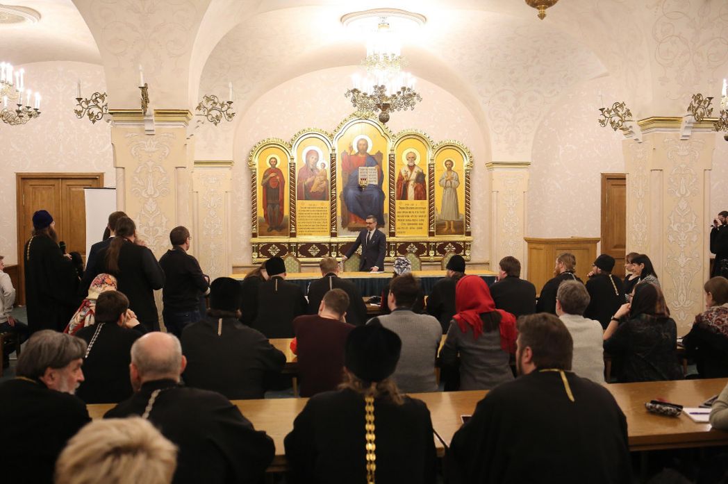 Говоря о роли Церкви в современном информационном пространстве, он заострил внимание на вопросе: что мешает церковным людям противостоять распространению той информации, с которой они мировоззренчески не согласны, нравственно не согласны? Ответ очевиден: спячка, инертность. Слишком слабая поддержка друг друга. Было приведено несколько наглядных примеров, вот один из них: есть живой очень качественный Телеграм-канал «Приходы». У него 837 подписчиков. А должны быть тысячи… Председатель Синодального отдела подчеркнул мысль, высказанную им накануне нынешних Рождественских чтений в интервью корреспонденту ТАСС: мессенджеры набирают обороты. Многие люди, в первую очередь молодые, вообще переходят на данный способ получения информации. «Значит, это то поле, в котором мы должны быть», – заключил он. Кстати, и в интервью ведущему государственному информационному агентству России, и на этой встрече в Храме Христа Спасителя Владимир Легойда обратил внимание на замечательный Телеграм-канал, который ведет ректор Московской духовной академии архиепископ Верейский Амвросий. Подписчиков у него 2,5 тысячи, хотя в академии и семинарии обучается около 800 человек. Но ректора читают не только семинаристы и студенты. В числе подписчиков и те люди, которым интересно, как учащиеся Московских духовных школ живут. Их подкупает личностная интонация владыки. «Как только появился Телеграм-канал архиепископа Амвросия, я его опубликовал. Когда несколько дней назад открыл свой Телеграм-канал «Семинариум» ректор Курской духовной семинарии архимандрит Симеон (Томачинский), я тут же постарался его продвинуть. Иного отношения друг к другу быть не может», – подытожил Владимир Романович.