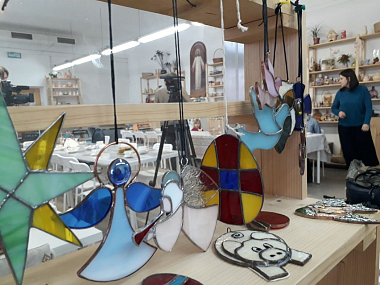 Восторг испытываешь, едва зайдя в помещение мастерских. Чего тут только нет: на полках и столах красуется и забавная филимоновская трехцветная игрушка, и классическая дымковская, и не столь, может быть, известная дивеевская – без росписи, греющая сердце природными нежными красками и задушевными сюжетами. Рядом присоседились веселые матрешки, вздымают вверх свои трубы ангелы… У стола трудятся ребятишки, складывая пряничный домик. Здесь же можно понаблюдать, как изготавливают витражные изделия. Двери ремесленного дома поминутно открываются, приходят взрослые и дети, садятся за работу.