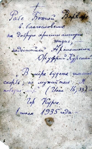 Итак, одной из монахинь, постриженных игуменом Мартинианом, была мама священномученика Онуфрия Екатерина Осиповна. В постриге она получила имя Наталия. После ареста сына монахиня Наталия осталась в Курске, где и упокоилась в марте 1938 года. Похоронена она на кладбище у Никитского храма.