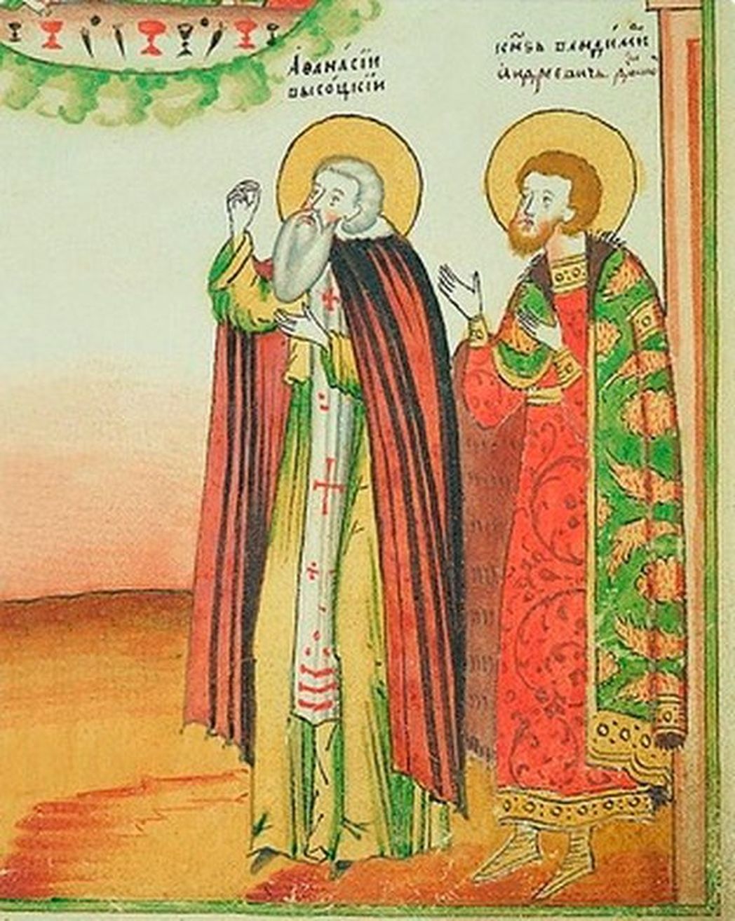 История обители связана с целым собором великих святых. Прославлены ее первые три игумена. Изначально возглавил монастырь преподобный Афанасий старший. Еще в Свято-Троицкой обители преподобного Сергия его почитали как мужа ученого и книгописца, много трудившегося для возрождения утраченной на Руси за годы татарского пленения преемственной связи с византийской духовной традицией. Господь устроил так, что Афанасий, оставив управление монастырем ученику, отправился в Царьград – сопровождая митрополита Московского Киприана, и прожил там более двух десятилетий, до самой кончины, в неустанной работе по переводу с греческого и переписыванию церковных книг. Рукописные книги, как и лучшие образцы иконописного искусства, преподобный отправлял на родину. Благодаря его трудам Высоцкий монастырь приобрел славу центра византизма на Руси.