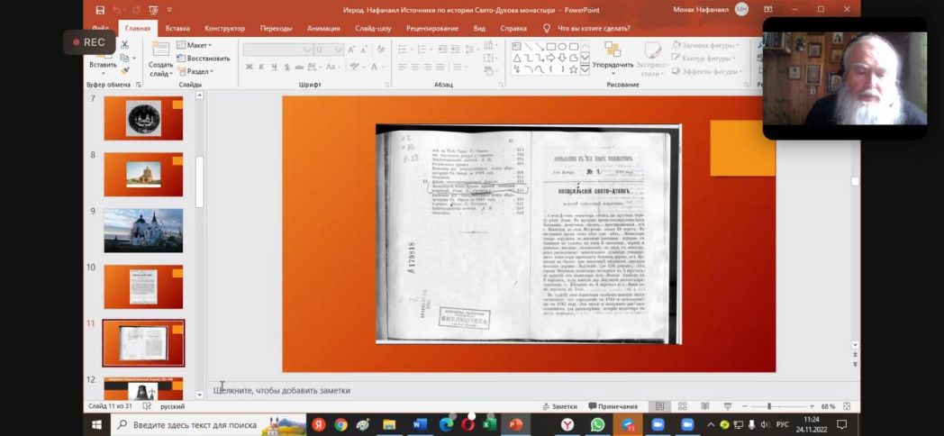 В докладе иеродиакона Нафанаила (Бобылева), насельника Свято-Духова монастыря Ливенской епархии Орловской митрополии (г. Новосиль), доктора педагогических наук, кандидата филологических наук, профессора соединились сразу две темы: следственные дела убиенных в 1919 году монахов Новосильской обители (этой теме был посвящен доклад отца Нафанаила на майской секции форума) и представленное в этот раз подробное описание источников по истории старинного Свято-Духова монастыря, которому оказывали покровительство несколько поколений династии Романовых, начиная с ее основоположника Михаила Феодоровича. Отец Нафанаил рассказал об основном источнике по истории обители XVII–XVIII веков: статьях Егора Русакова, учителя, а впоследствии помощника смотрителя Новосильского духовного училища, которое 65 лет действовало в монастырских стенах. Благодаря этим статьям мы имеем сведения о драматических обстоятельствах закрытия и восстановления монастыря в 60-х годах XVIII века, а также о строительстве Свято-Троицкой церкви, которая по сей день является его главной достопримечательностью. Иеродиакон Нафанаил осветил также такое спорное явление как «исповедные ведомости», оказавшие весьма негативное влияние на монашество XIX века…