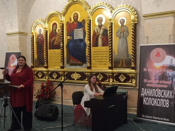 Завершил конференцию доклад Олеси Ростовской, композитора, карильониста, звонаря (Москва) «300 лет русского карильона». В живой увлекательной форме автор познакомила аудиторию с историей трех инструментов, появлением которых в России мы обязаны Петру I: еще в юные годы, путешествуя по Европе, царь полюбил звучание карильона, соединяющего в себе колокола, подобие органа и часового механизма. Построив столицу на Неве, государь установил первый инструмент в соборе Петропавловской крепости. Второй карильон взамен петровского, утраченного при пожаре, заказала за границей императрица Елизавета I, он прослужил целое столетие. Ныне на том же историческом месте установлен карильон известной фирмы «Petit & Fritsen» (Нидерланды), он был подарен городу правительством Фландрии с участием многих спонсоров из разных стран. В крепости регулярно проводятся концерты, в 2018 году состоялся 17-й фестиваль карильонной музыки.Финалом юбилейных событий стал вечер, который прошел в Трапезных палатах Храма Христа Спасителя. Встретившись еще раз, все, кого познакомили и объединили усилия по возвращению колоколов Данилова монастыря, с радостью признали, что воплощение этой идеи стало для них прежде всего историей о дружбе и сотрудничестве. И теперь знаменитый колокольный ансамбль с полным правом можно назвать символом взаимопонимания. Гостям, чье участие в деле возвращения колоколов было особенно значимым, наместник Данилова монастыря архимандрит Алексий вручил памятные сувениры. Затем состоялся концерт, в котором выступили Праздничный хор Данилова монастыря под руководством Георгия Сафонова,ансамбль старинной музыки «Контрапунктус», Ирина и Елизавета Морозовы (цимбалы, фортепиано), Олеся Ростовская (терменвокс).